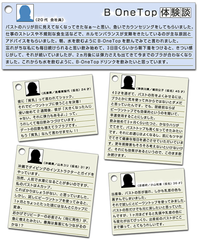 忘れがちな私にも毎日続けられると思い、飲み始めて3日目くらいから朝下着をつけると、きつい感じがして、それが続いていましたが、2日後には弾力さえも出てきて今までのブラが合わなくなりました。これからも水を飲むように、ビーワントップドリンクを飲みたいと思っています |